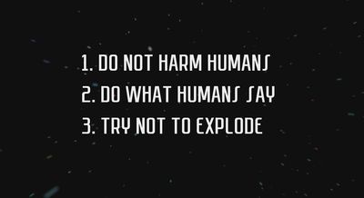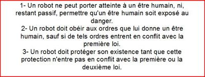 Dépendamment de l'avancé de nos travaux nous suivront LES LOIS DE LA ROBOTIQUE dans sa version Asimov ou dans sa version actuelle (voir plus bas nos grands textes de références).